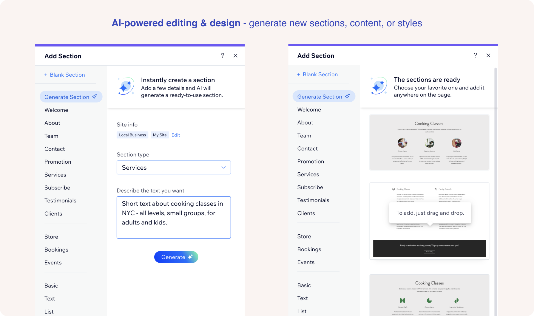 With a simple, user-friendly prompt, users could generate alternative layouts, visual assets, or text content, as an addition to or replacement for the basic collection.